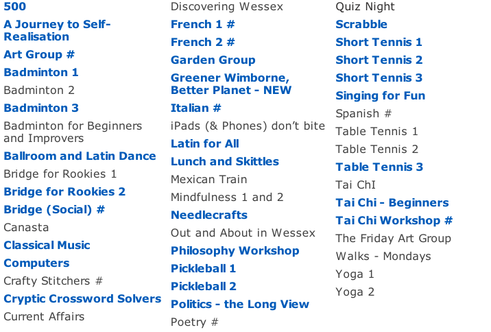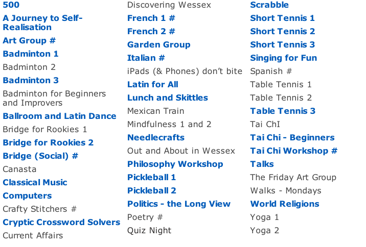 Groups with room for more members, as at 29th January, are shown in blue; groups that are full and may have waiting lists are in black.